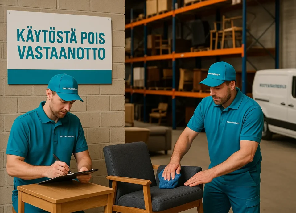 4. Jatkokäsittely – Hyväkuntoiset huonekalut ohjataan lahjoitukseen tai myyntiin, huonokuntoiset kierrätykseen materiaalien mukaan.